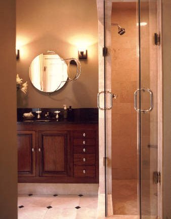 Traditional styling and hardware. Stained mahogany with gray panel molding and a granite top.