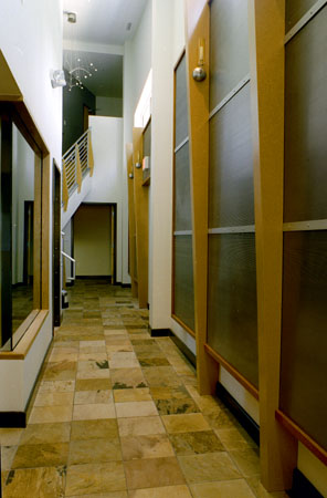 | I built the elements of this entrance hall, which was designed by Russ Berger. Clear finish MDF columns, cherry frame, stainless steel perforated panels. |
